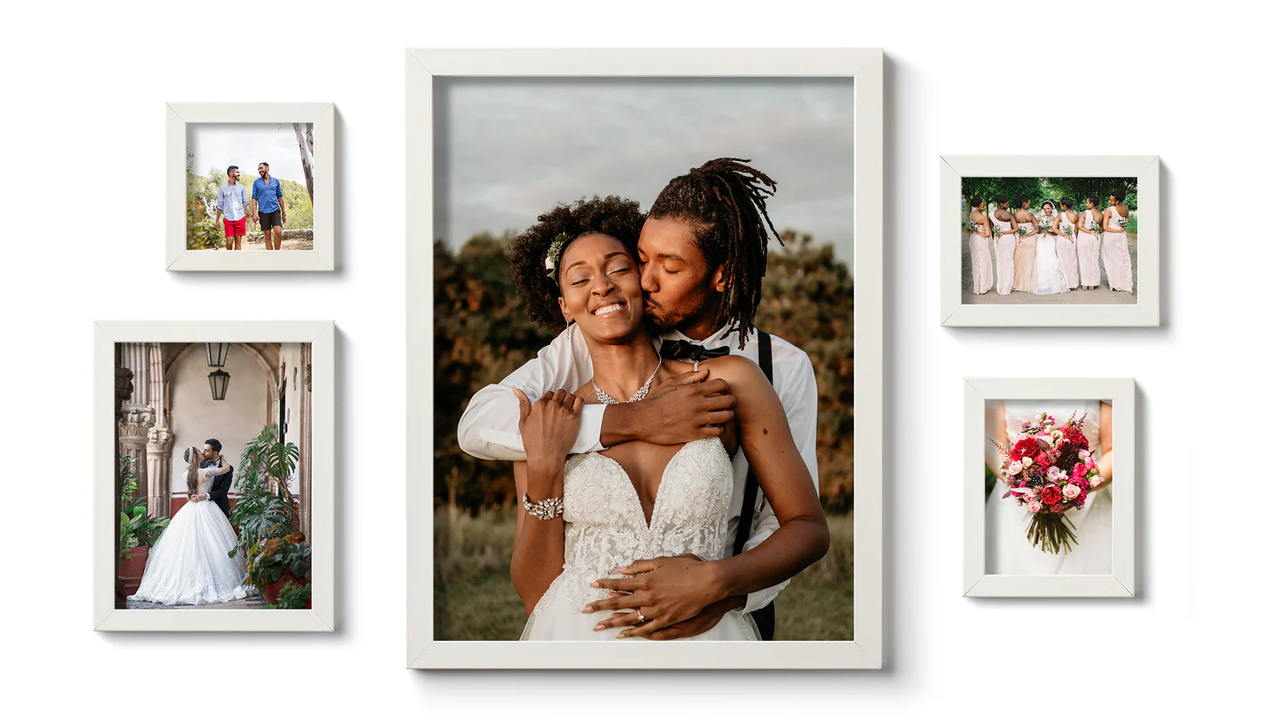 And of course, displaying your favorite photos in your home is critical. Our homes provide ample opportunity to focus on the moments that matter most in our lives — the ones that make us smile, fill our eyes with happy tears, and lift our spirits on stressful days. Celebrate your big day every time you enter the living room or glance on the mantle. Choose a select few images and tell your story with a Storyboard or create your own gallery wall with highlights of all your favorite moments.